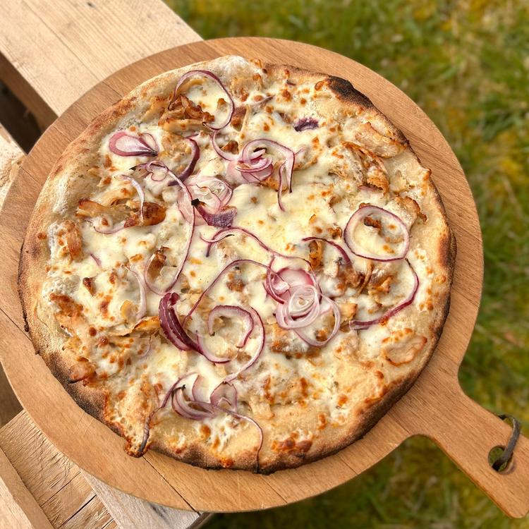Base crème, mozzarella Galbani, oignons rouges (producteur local), sauce blanche, viande de kebab halal.