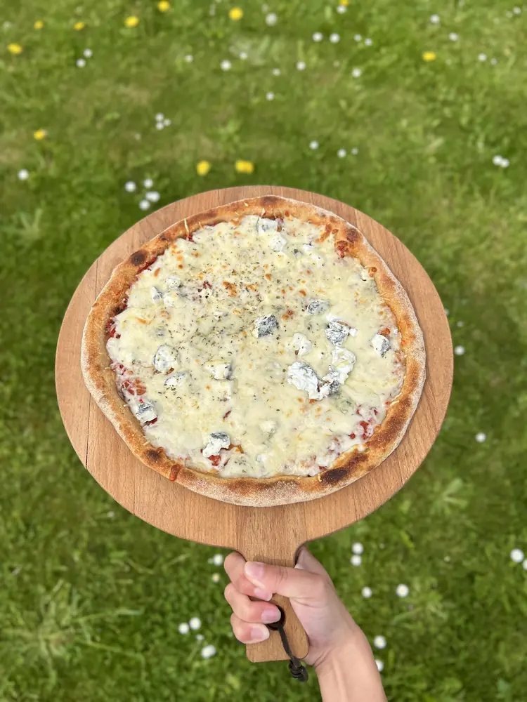 Base tomate, viande hachée, crème de roquefort AOP maison, mozzarella Galbani.