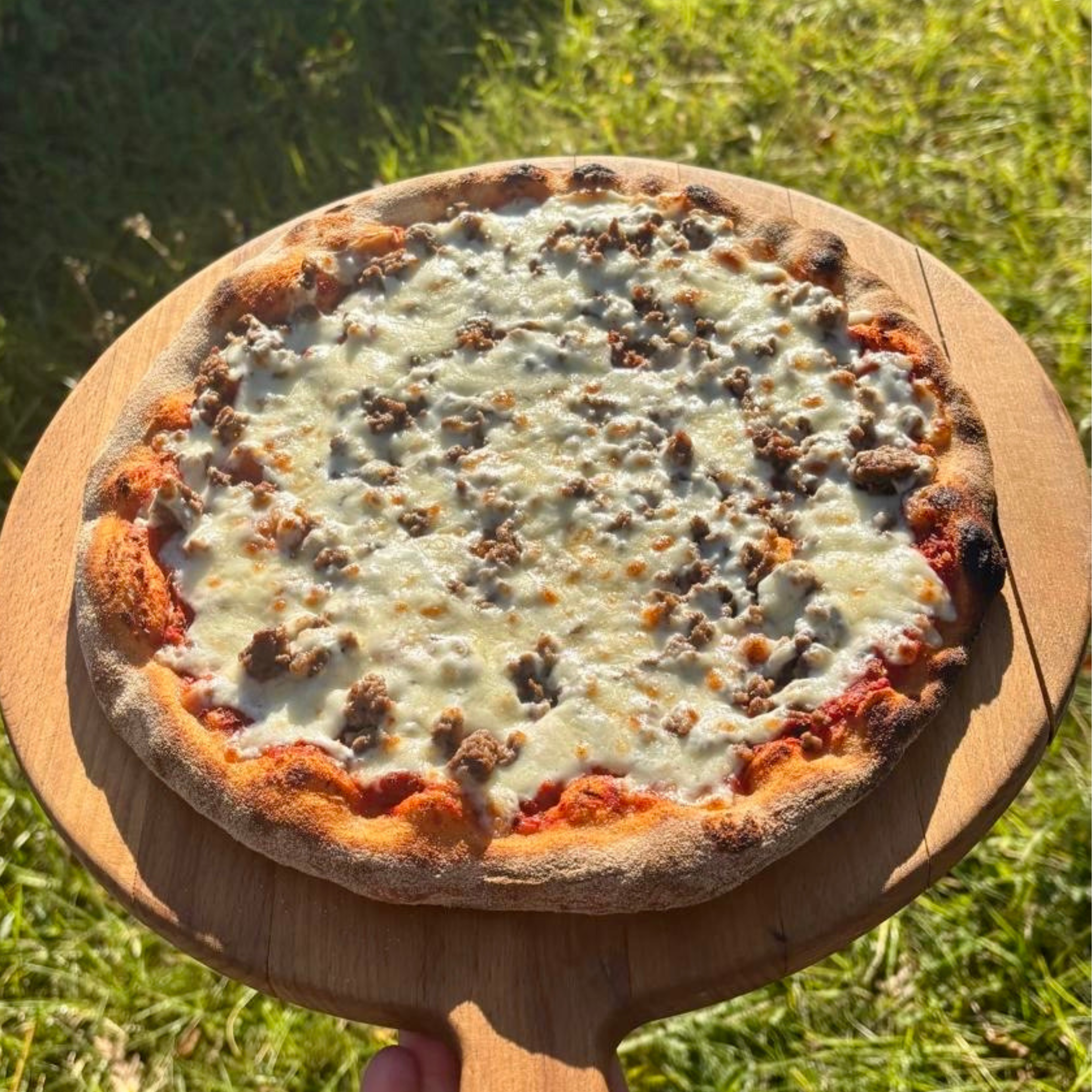 Base tomate, viande hachée, crème de roquefort AOP maison, mozzarella Galbani.
